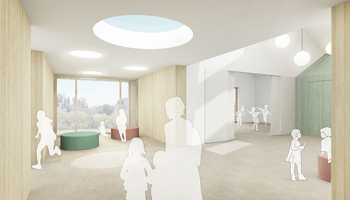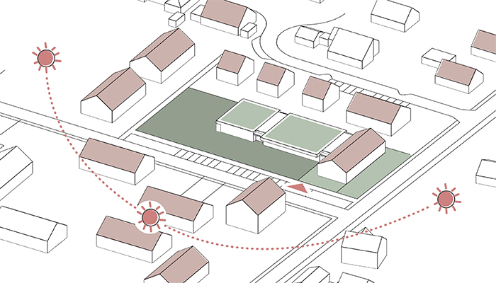 Das Umfeld ist im Wesentlichen von Ein- und wenigen Mehrfamilienhäusern geprägt, die überwiegend eingeschossig, teilweise zweigeschossig sind. Die vorherrschende Dachformen sind flach- und steilgeneigte Dächer. Die neue Kita soll Teil dieses Ortsbildes sein, sich aber gleichermaßen der besonderen Funktion und Größe und entsprechend zeigen.