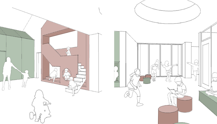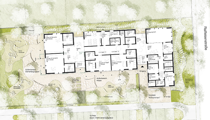 Die einzelnen Baukörper der Kita orientieren sich in ihrer Gliederung an den wesentlichen Funktionen des Raumprogrammes: Die Räume für die Krippen und die Elementargruppen werden im Baukörper mit flachem Gründach angeordnet – die Räume für die Verwaltung sowie die Gemeinschaftsräume im Satteldach-Baukörper entlang der Raiffeisenstraße.